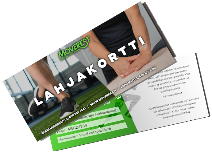Moverestin lahjakortti on loistava tapa antaa läheiselle mahdollisuus huolehtia omasta hyvinvoinnistaan ja kehonhuollostaan. Lahjakortin voi ostaa mihin tahansa palveluumme verkkokaupasta tai molemmista toimipisteistämme Tampereella.